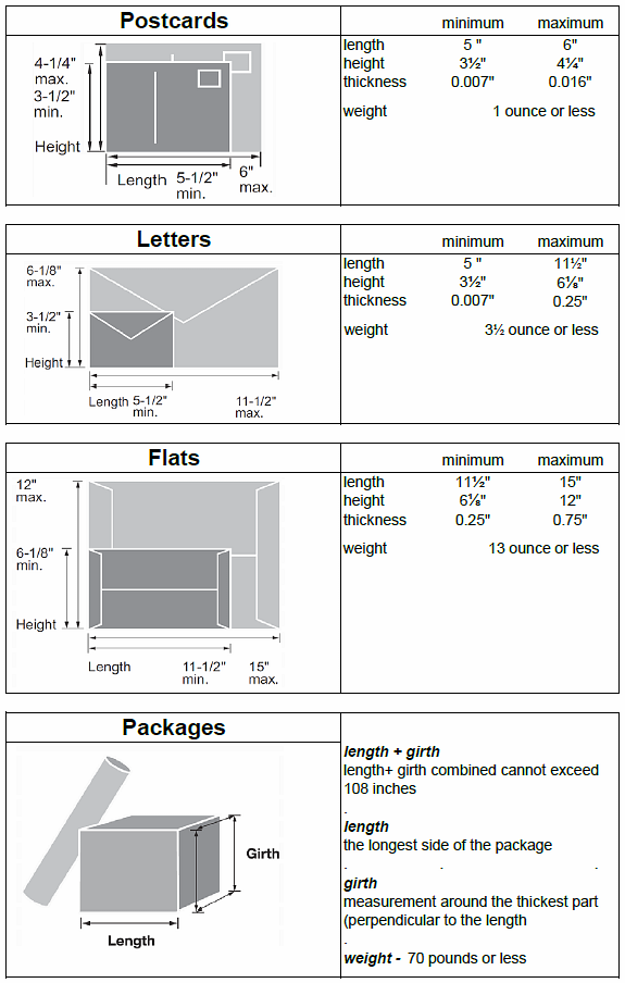The Post Office usually has at least one rate change a year-depending on weight in ounces. Also, an item once considered a letter is now classified as a letter, flat or package--based on its thickness. Thickness is measured with the item lying on a flat surface--NOT pressed down.