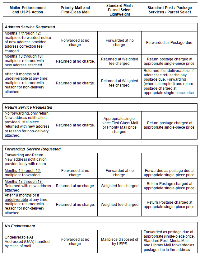 The endorsements are the same for all classes of mail, but the treatment and cost differ by class of mail. Use of an ancillary service endorsement on a mailpiece obligates the mailer to pay any applicable charges for forwarding, return, and separate address notification charges.